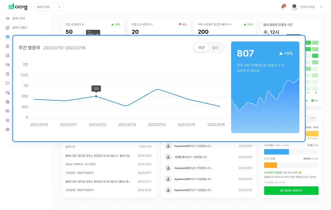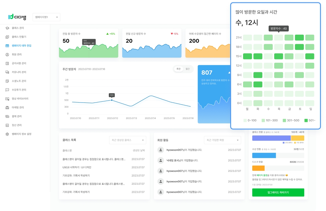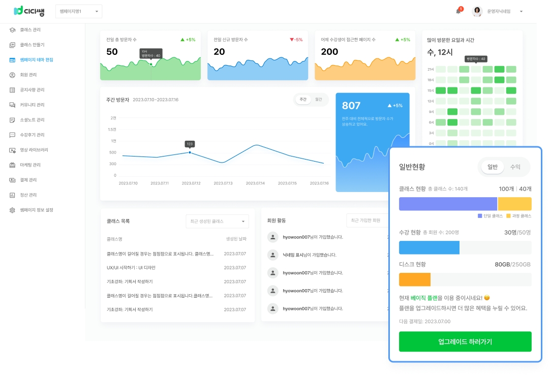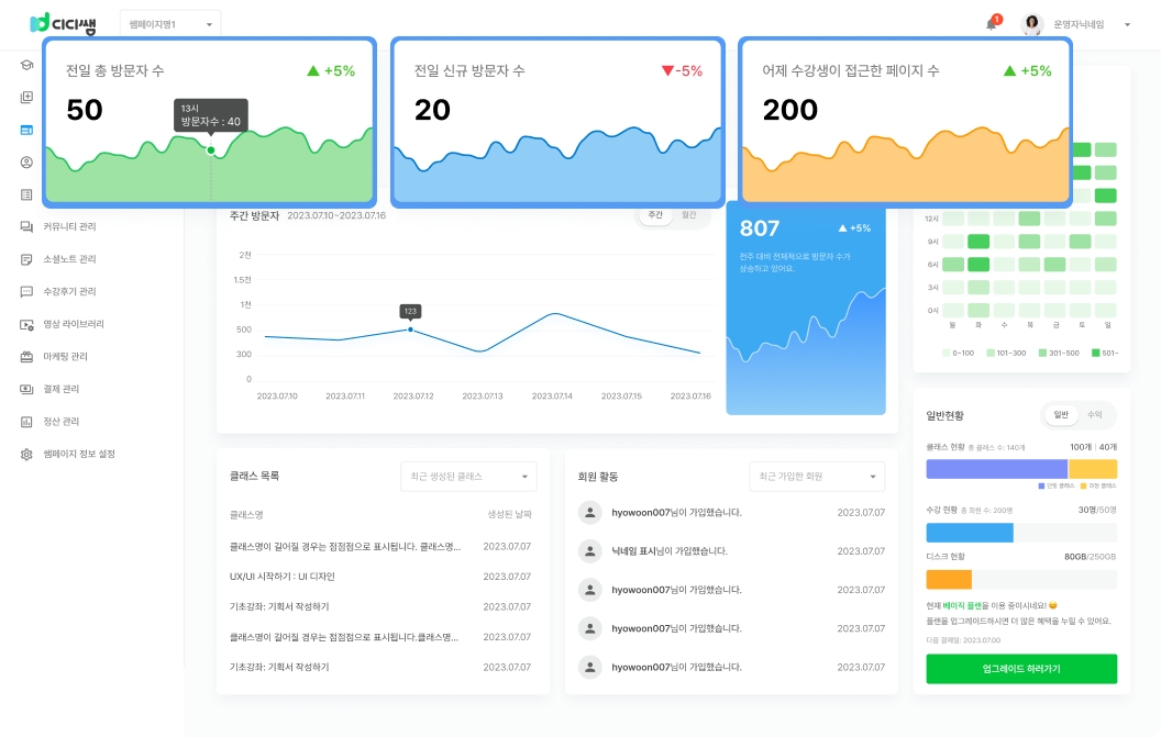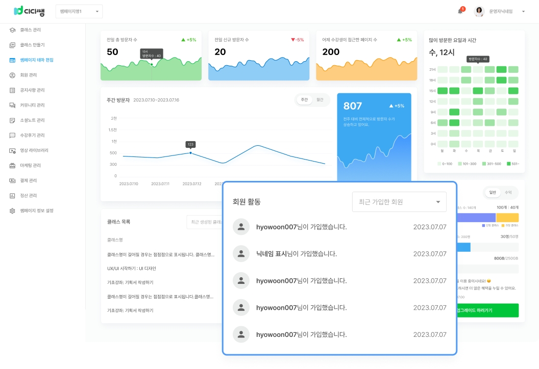 회원활동(최근 가입한 회원, 수강시간, 수강 수 높은 순) 5개의 리스트로 제공됨