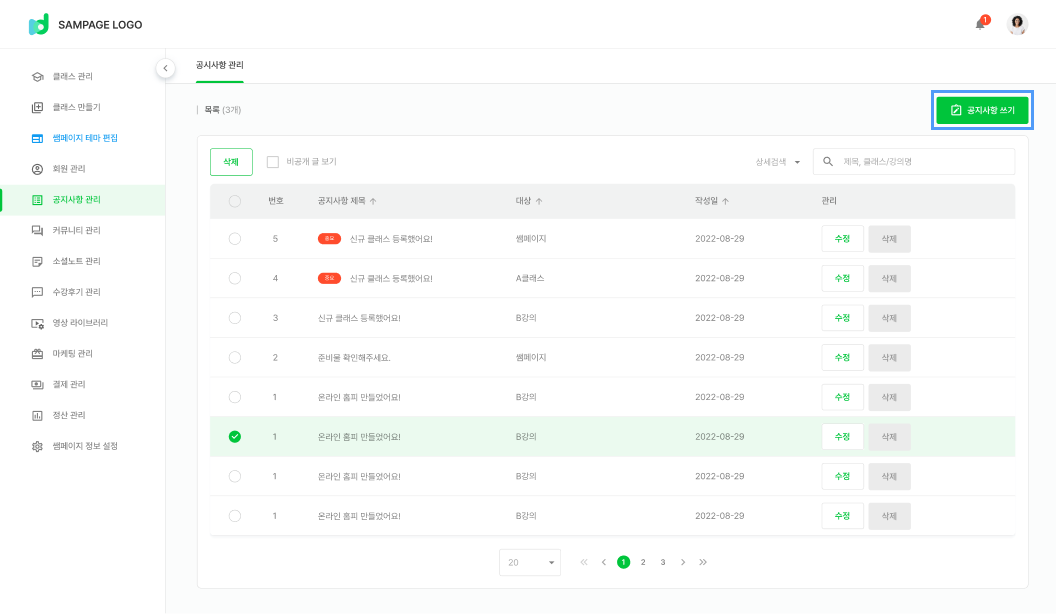 가입한 쌤페이지의 운영자나 부운영자라면, 공지사항 대상 설정은 [쌤페이지] [클래스/강의]로 구분하여 설정할 수 있습니다