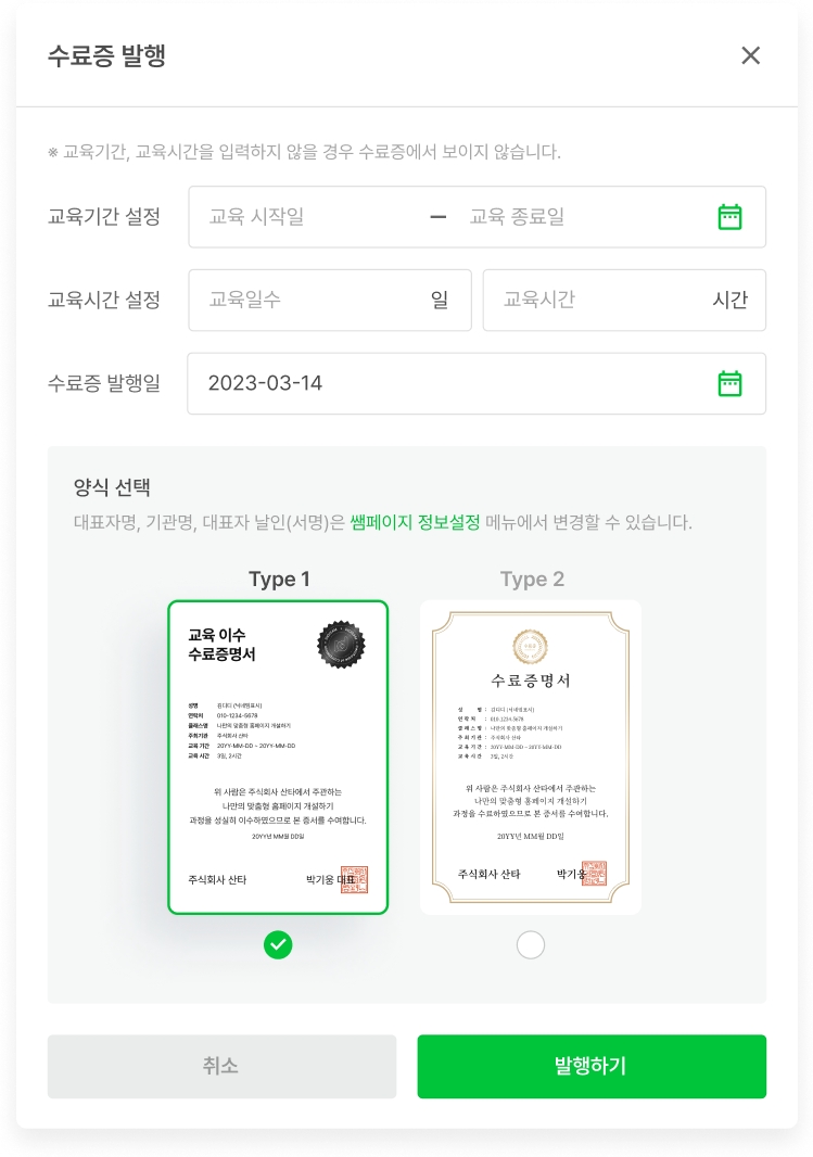 수료증 타입을 선택 하실 수 있고, 교육기간과 시간, 수료증 발행일 등을 설정하여 최종 발행 할 수 있습니다.