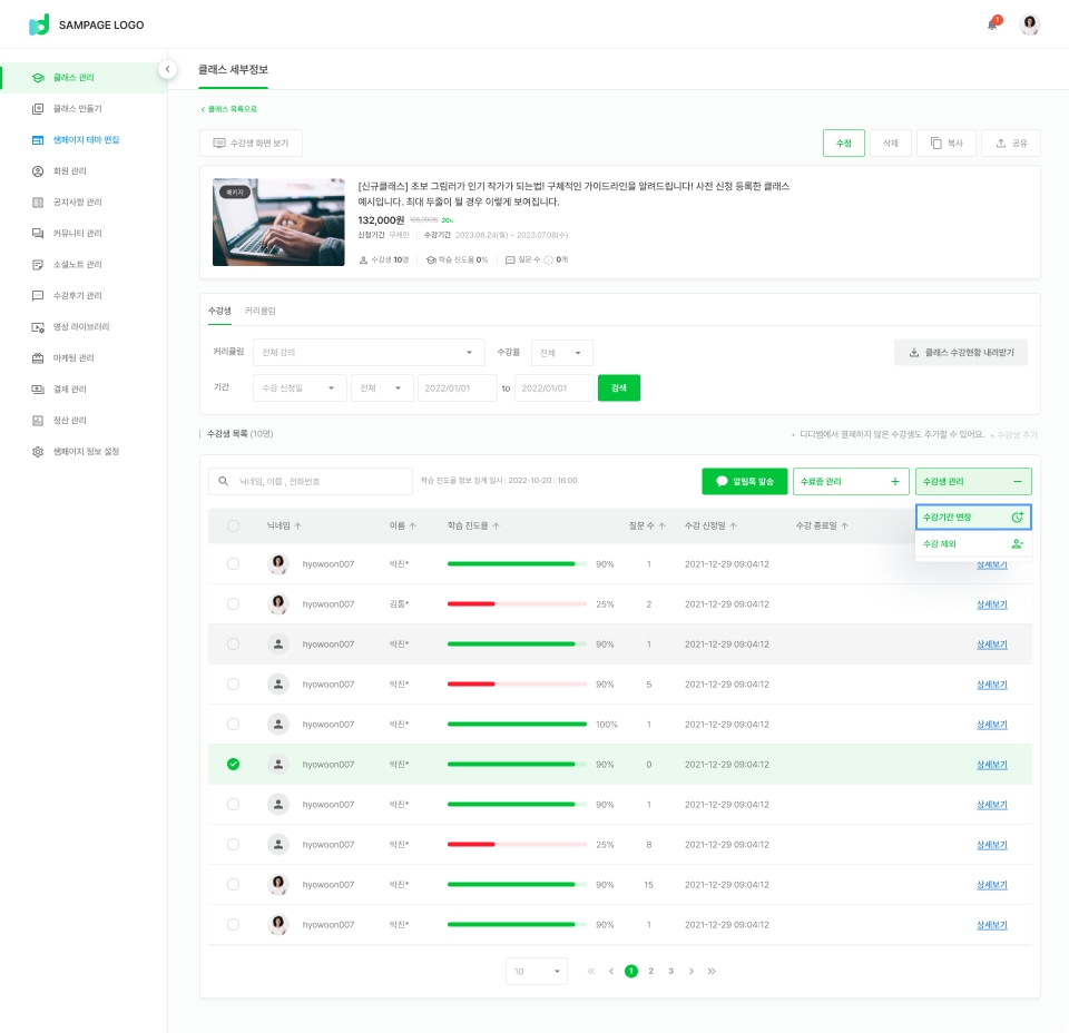 클래스의 수강 기간 연장이 아닌 수강 연장 기능을 이용 하시어 수강생들의 수강을 연장 해주실 수 있습니다. [클래스 세부정보] > [수강생 관리] > [수강 연장] 으로 쉽게 설정 가능 합니다.