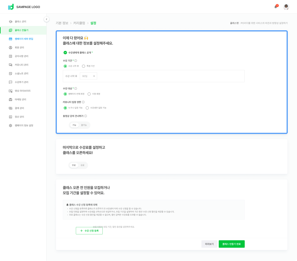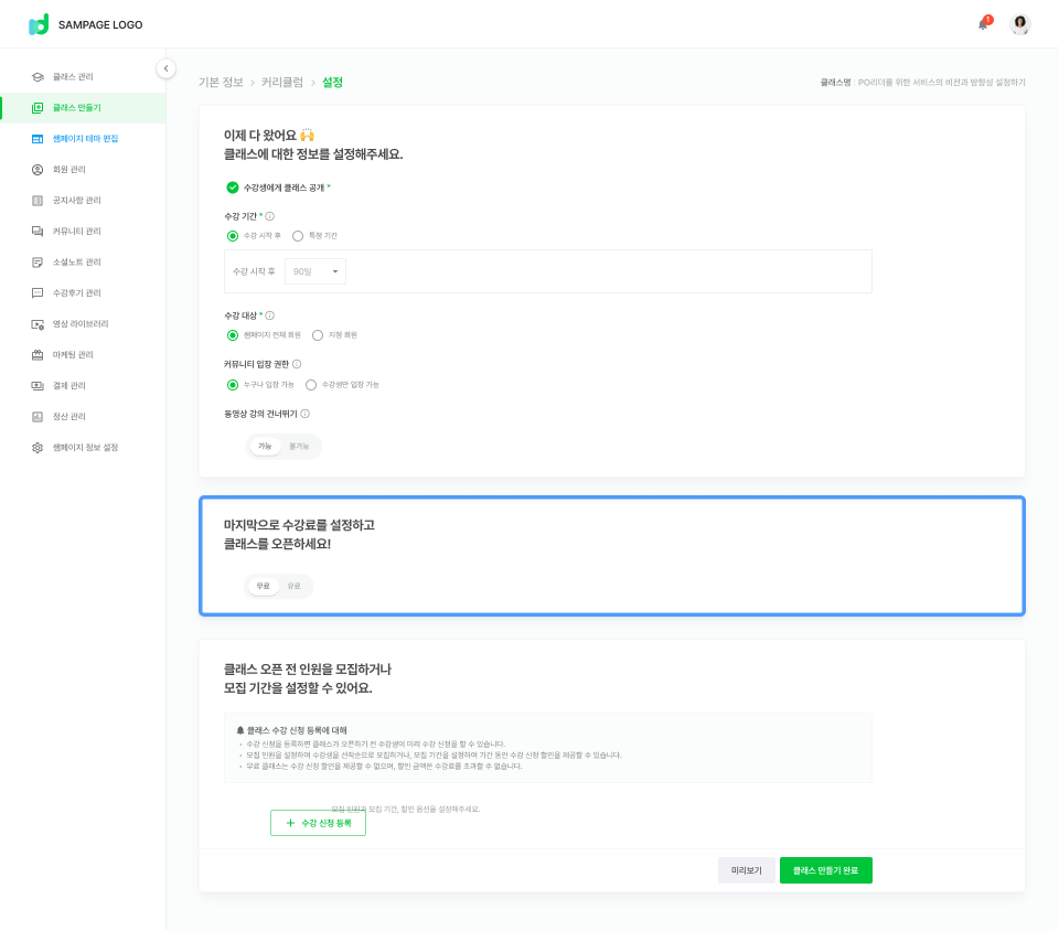 개설하는 클래스를 무료클래스 또는 유료클래스로 설정할 수 있습니다
