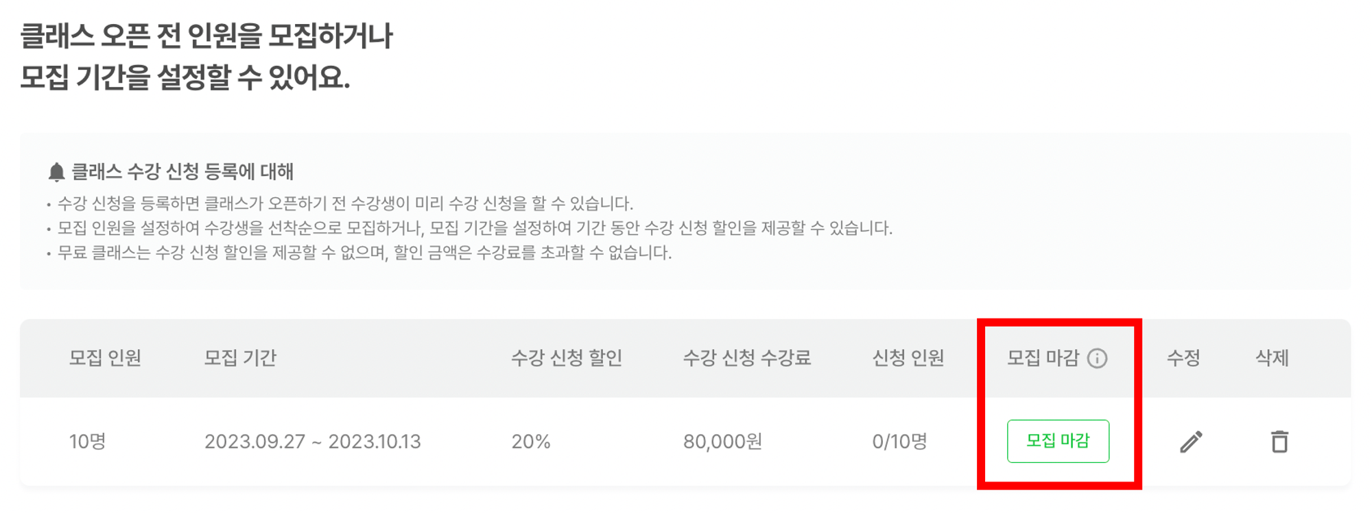* 모집을 마감했거나 수강 신청이 끝나면 인원 또는 기간을 수정한 후에 **다시 모집을 재개**할 수 있습니다.