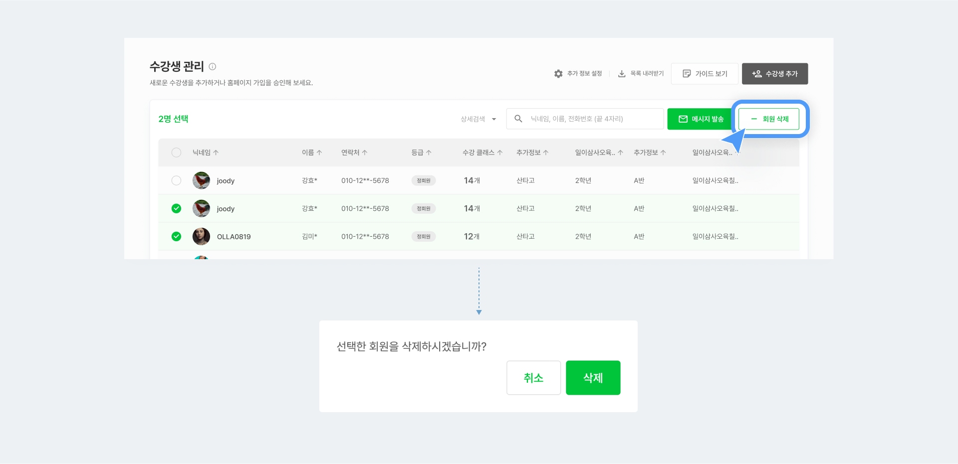 수강생을 추가하거나 여러 회원에게 일괄적으로 메시지를 발송하는 등의 기능을 사용할 수 있어요.&#x20;