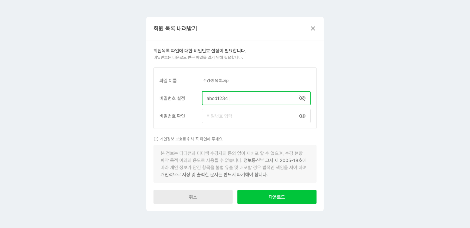 * 수강생 개인정보 보호를 위해, 비밀번호 설정은 필수에요.<br>