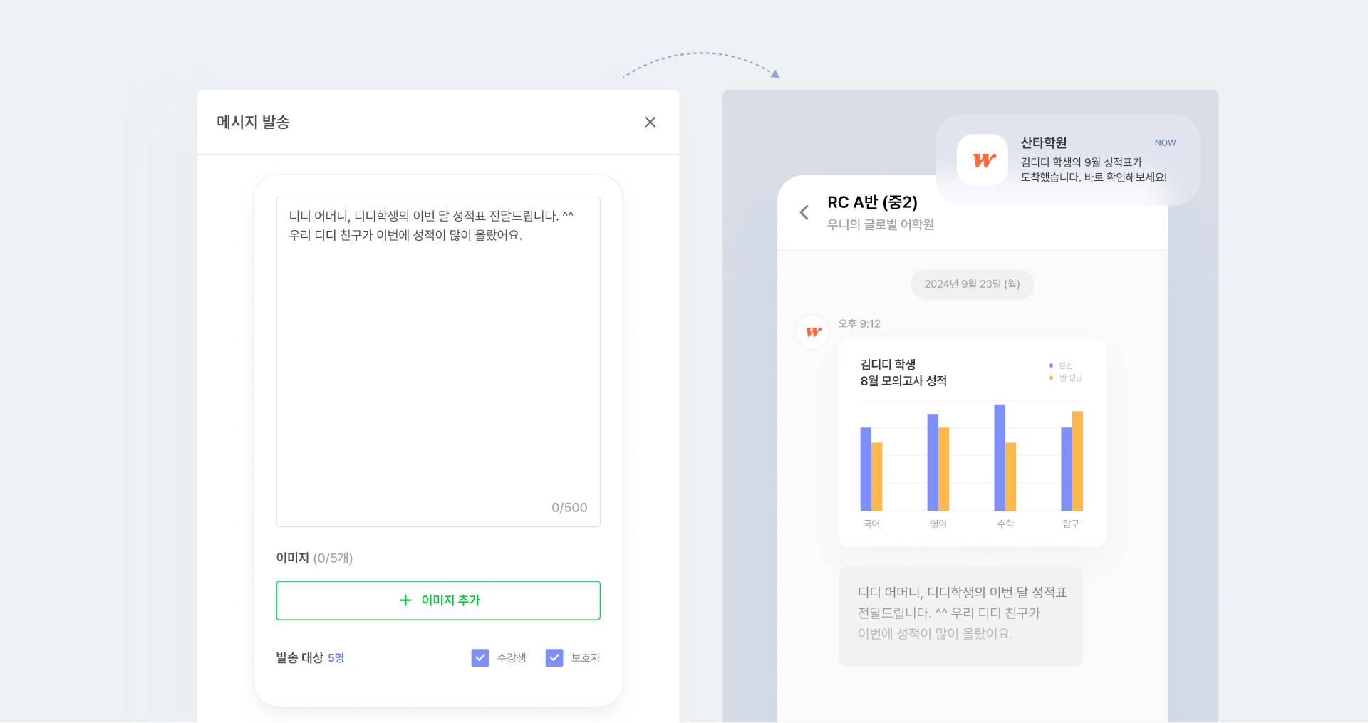 * 수강생과 연결된 보호자에게도 보낼 수 있고, 메시지 관련 자세한 내용은  **🔗**[**링크**](https://didisam.gitbook.io/guide-new-ver/features/message)를 클릭해 주세요.