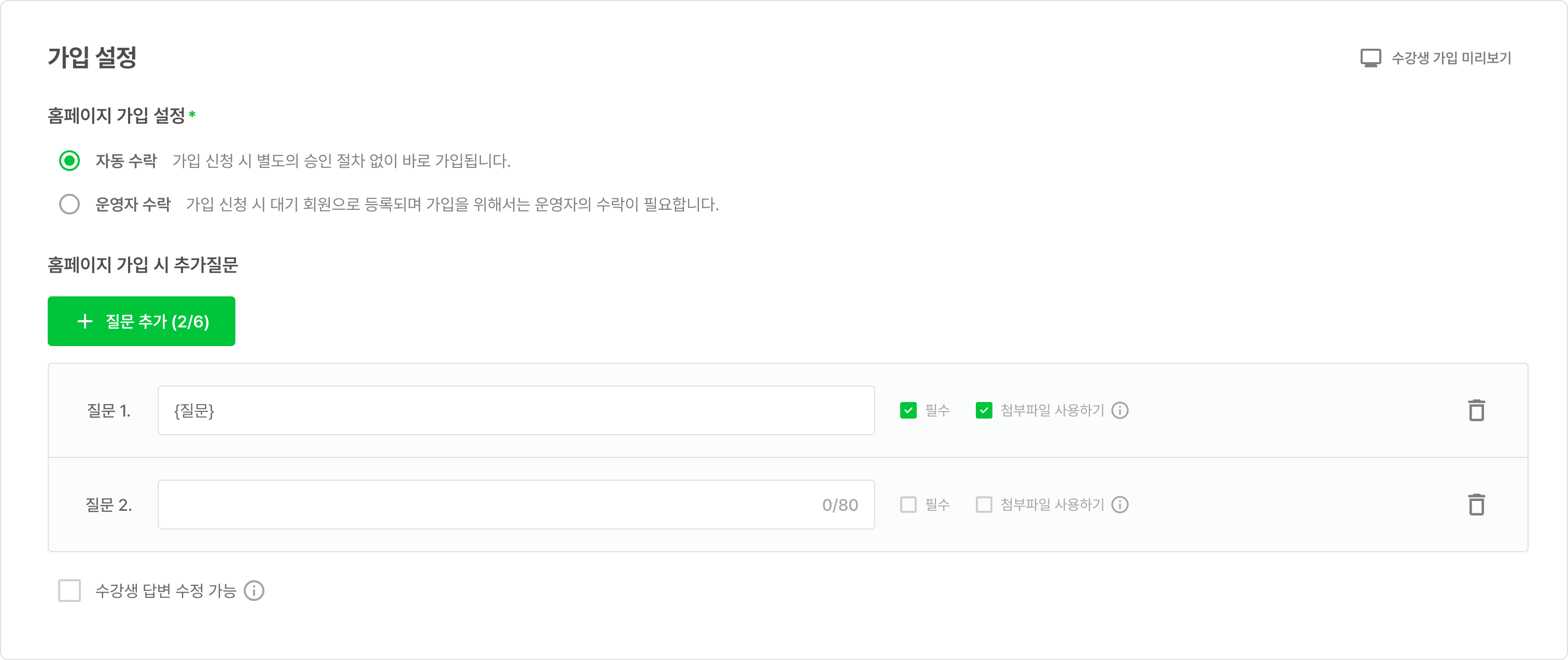 * 각 질문 별로 수강생이 답변에 파일을 첨부할 수 있도록 할 것인지 설정할 수도 있어요.