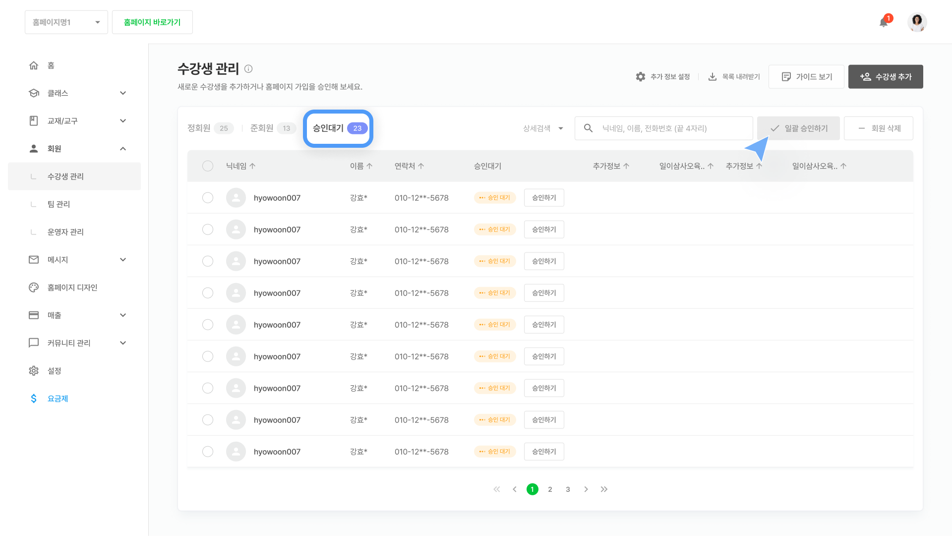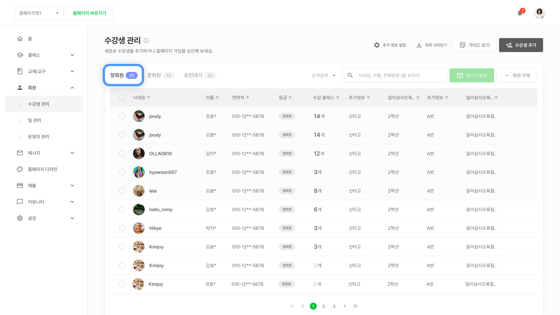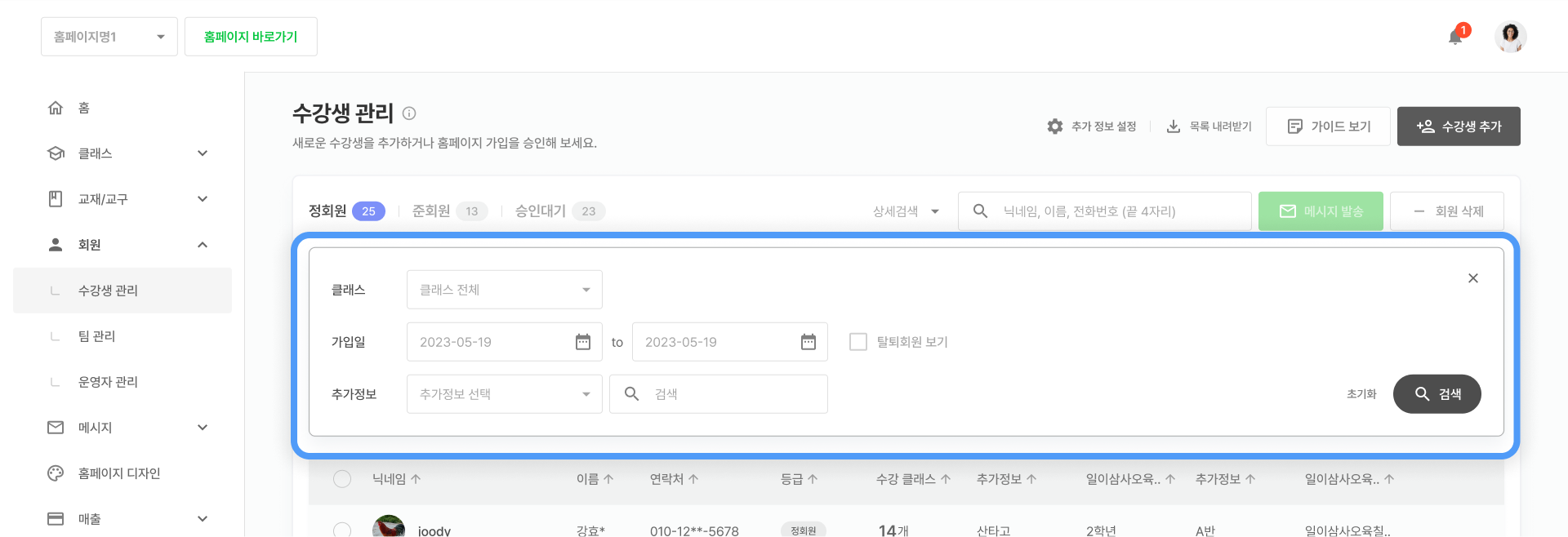 홈페이지에 가입된 수강생들을 관리하는 것에도 다양한 기능들이 있는데요!\