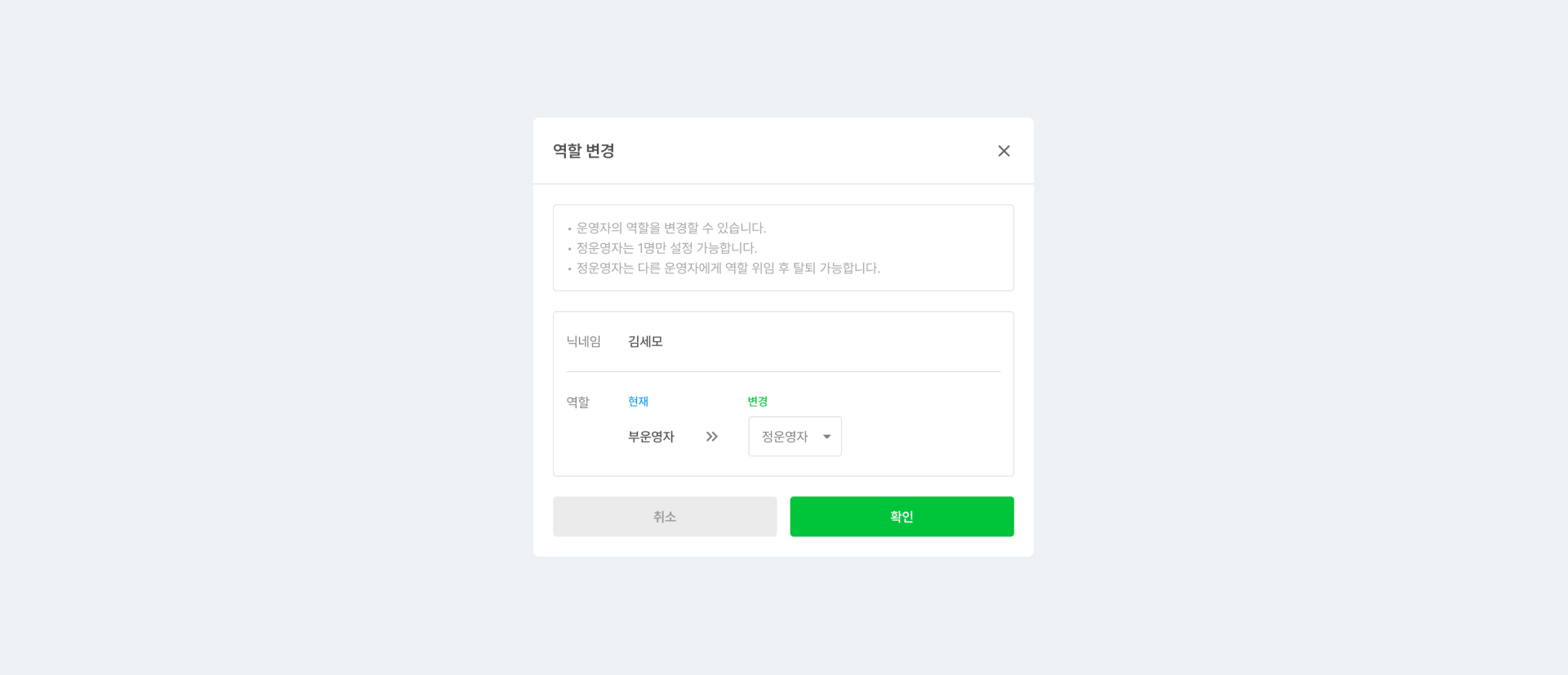 * 운영자의 역할을 변경할 수도 있으며, 정운영자 등급을 위임할 수도 있어요.
