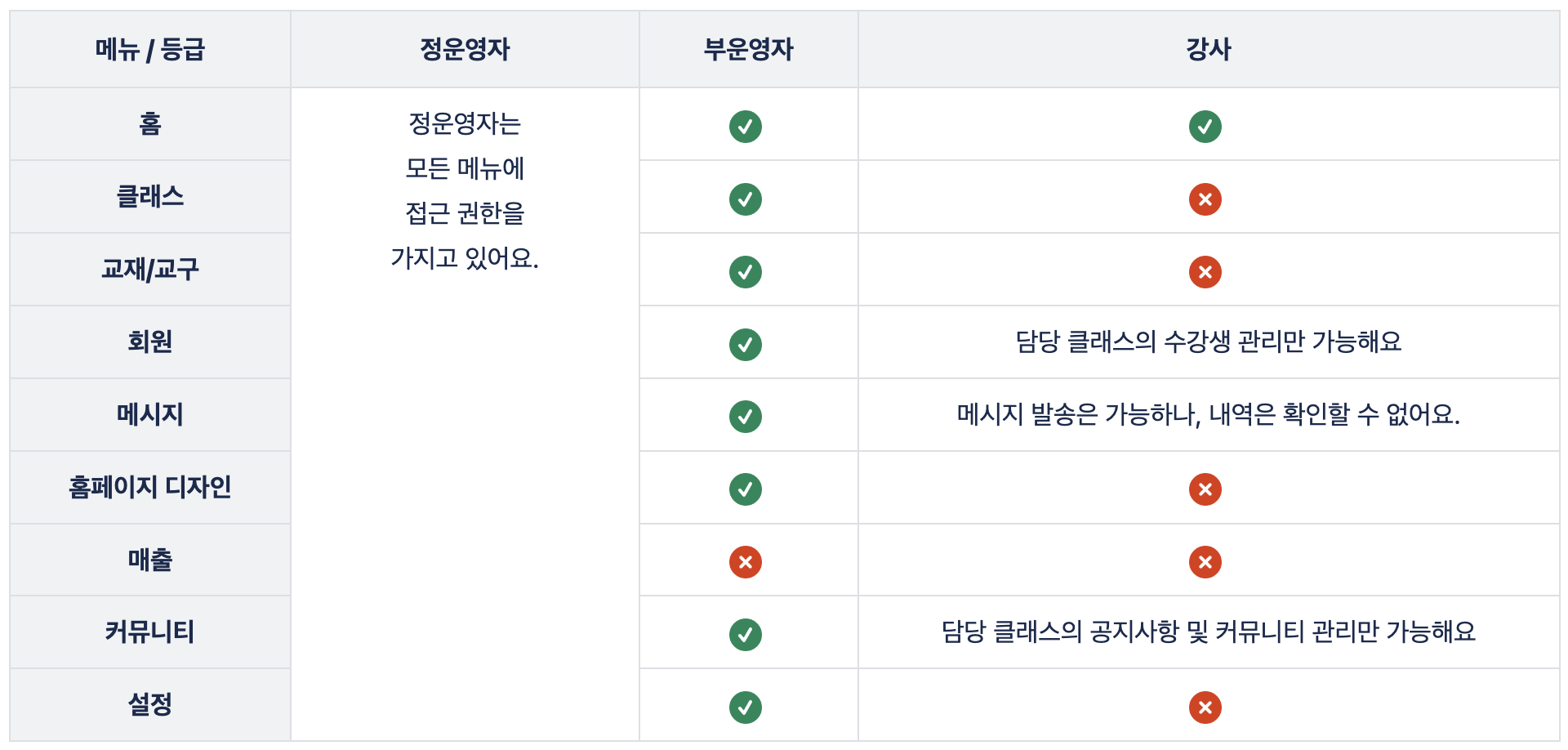 * 부운영자와 강사 등급의 경우, 같은 메뉴 안에서도 세부 기능에 대한 \