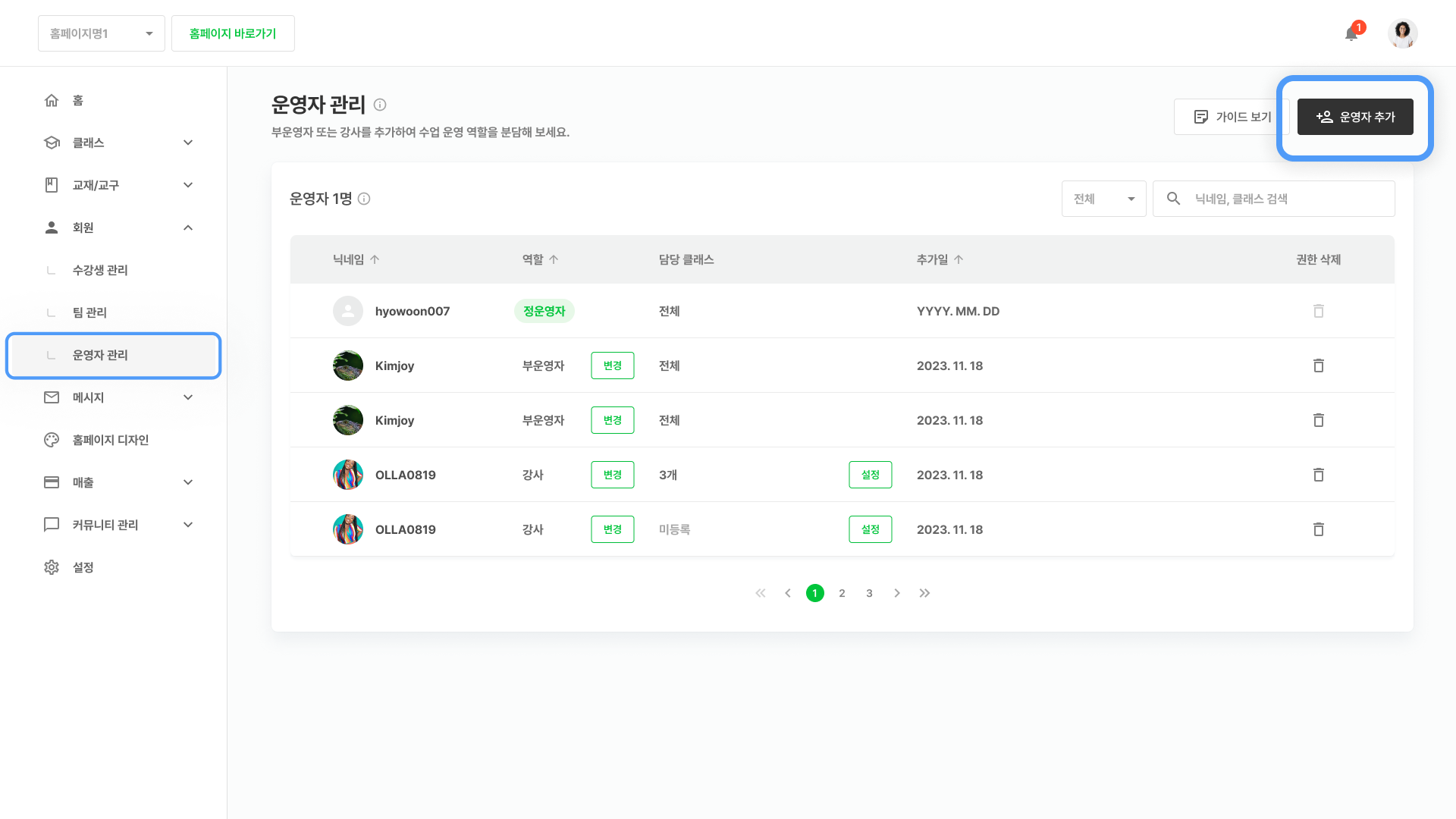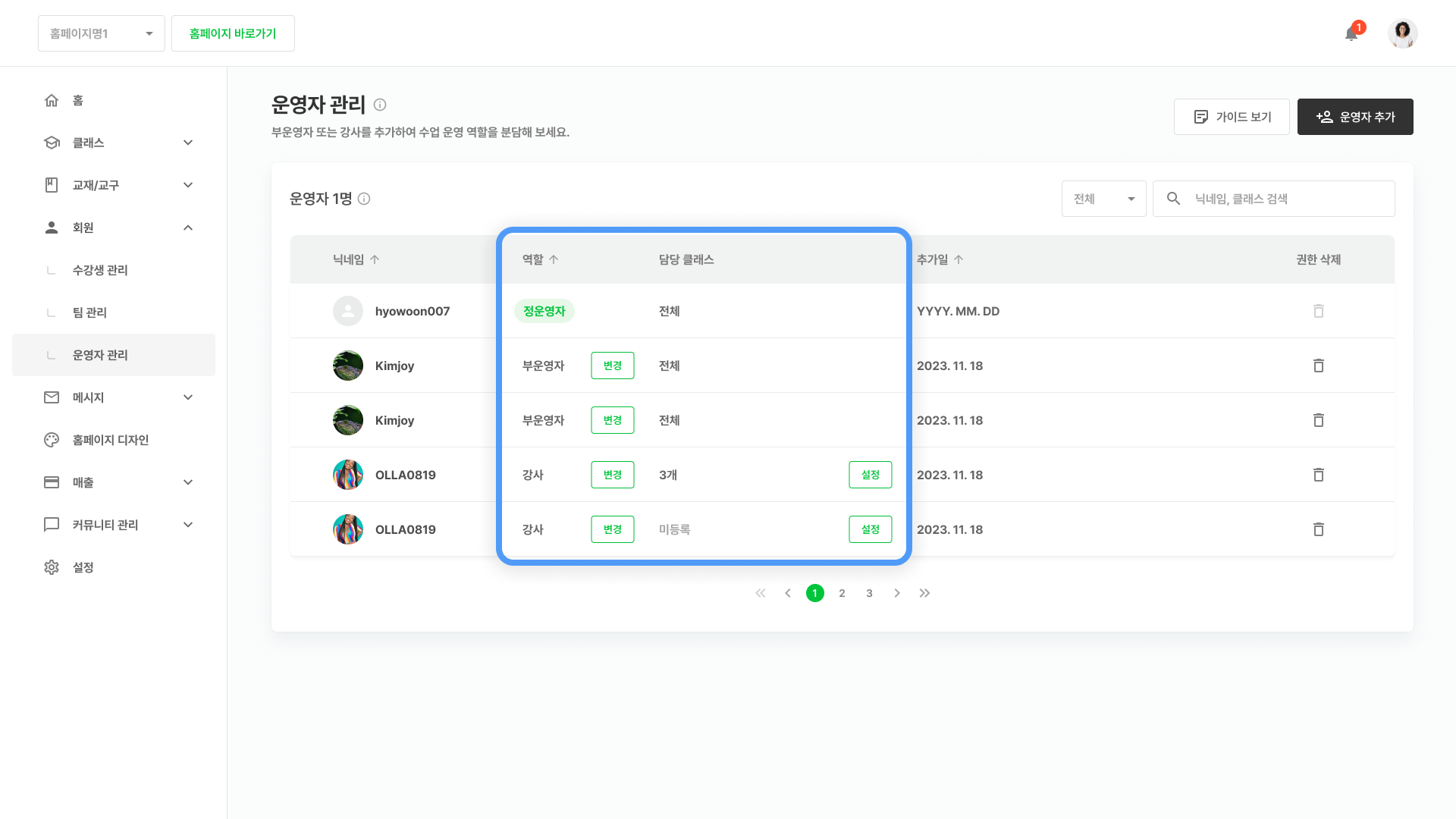 * 권한 삭제 버튼을 통해 운영자 권한을 회수할 수도 있어요. 강사의 경우 담당 클래스를 설정해 주세요.