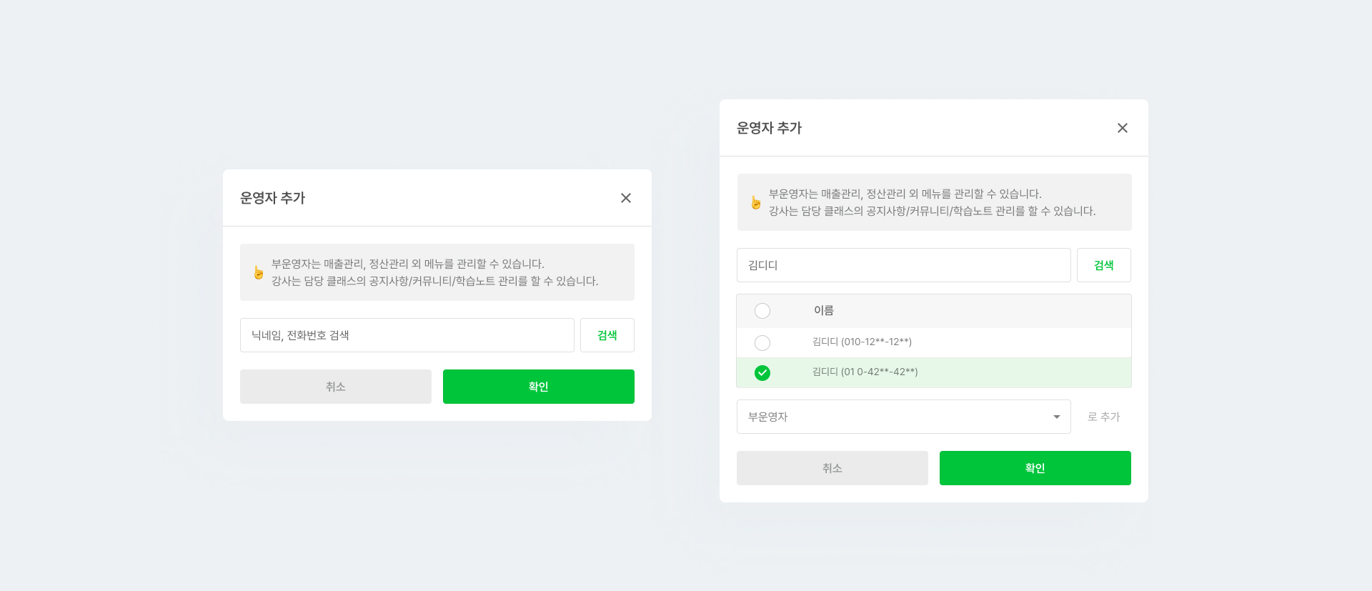 * 운영자 등급 지정은 정운영자만 가능하며, 지정 가능한 부운영자와 강사 개수에는 제한이 없어요.